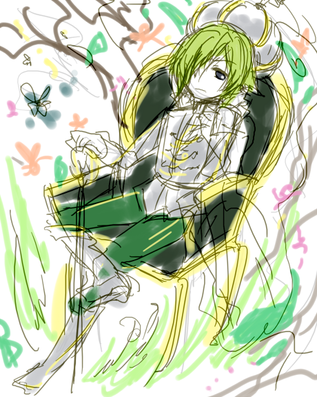 黄緑色の髪に銀(白)色の瞳を持ち、性格は無口・嘘つきで追加要素は味覚音痴・楽器。